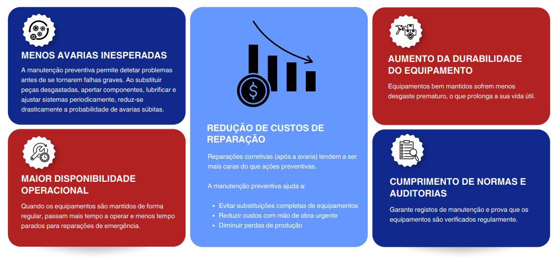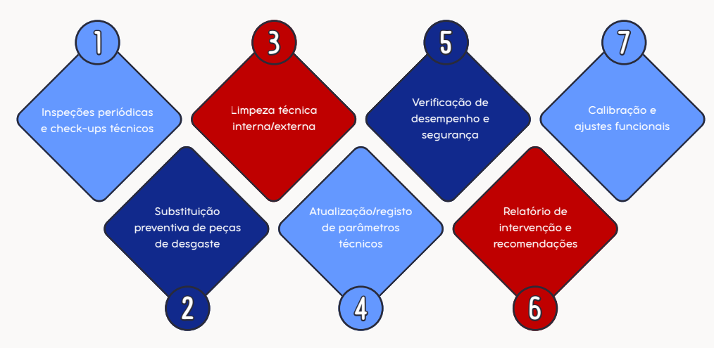 A manutenção preventiva baseia-se em intervenções técnicas planeadas e periódicas, destinadas a antecipar e prevenir falhas antes que estas ocorram. Por meio de inspeções rigorosas, calibrações precisas e ajustes técnicos, assegura-se o funcionamento seguro, fiável e contínuo dos equipamentos. Este serviço é fundamental para instituições e empresas que dependem de equipamentos técnicos em operação diária, contribuindo para a redução de avarias, aumento da vida útil dos equipamentos e otimização do desempenho operacional.
